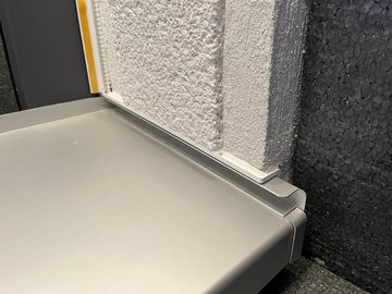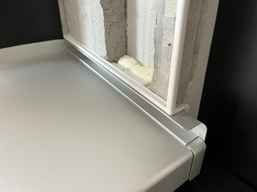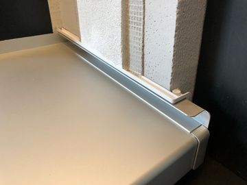 Die Profile werden rechts und links genau dort auf die Fensterbänke eingebaut, wo später der Putz endet. Im Außenbereich ist das exakt angebrachte Profil abschüssig, sodass das Wasser abfließen kann. Auf diese Weise kann im Bereich der Fensterbank kein Wasser mehr in den Putz eindringen. Folgeschäden im Bereich der verputzten Laibung sind dadurch ausgeschlossen.